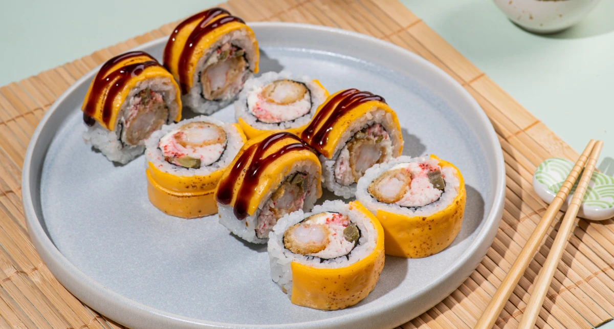 Tempura shrimp and crab mix go together with cream cheese and cheddar. Jalapeño brings a light heat, while sauces enhance the flavor and make it more expressive.