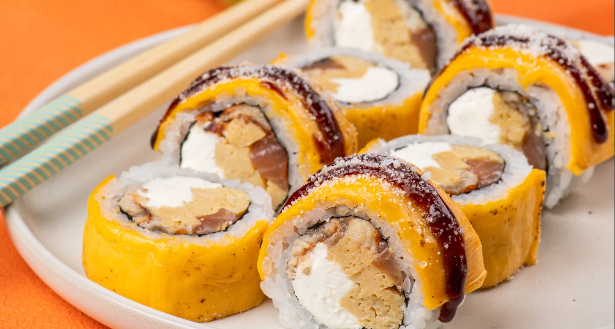 Eel and marinated salmon create a rich base. Cream cheese and tamago soften the taste, while unagi adds a light sweetness.