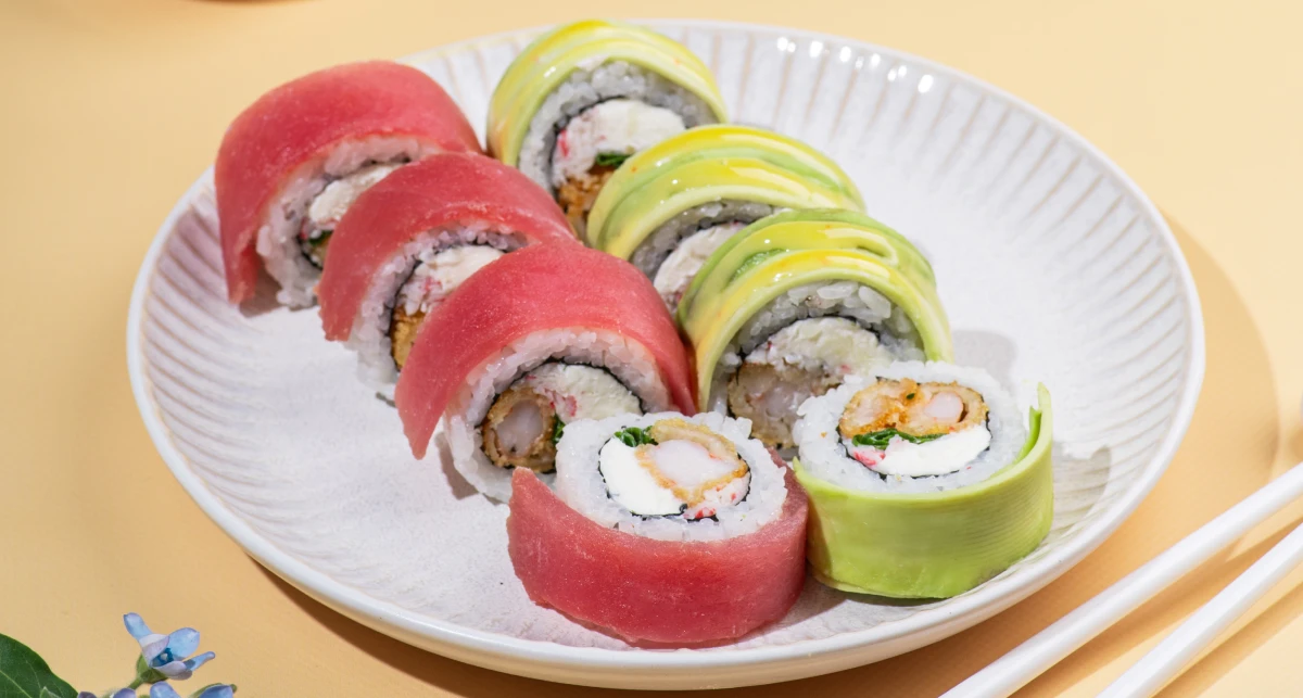 Tuna and shrimp form the base. Avocado and cream cheese soften the taste, iceberg lettuce and lime refresh it, while sauces tie the whole flavor palette together.